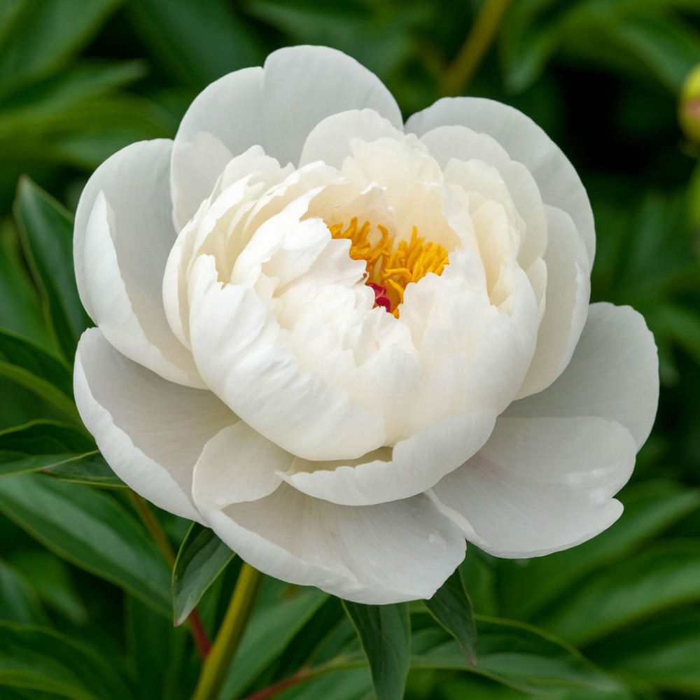 Цветок простой, чисто белый, с неровными краями. Очень красив в цветении, куст словно снежный сугроб, так как листьев совсем не видно. Цветет продолжительнее обычных японских пионов.